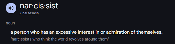 As we move to a more phycological definition, narcissism is described more specifically at a state of being. “Selfishness, involving a sense of entitlement, a lack of empathy, and a need for admiration, as characterizing a personality type.” So, a selfish person that needs admiration.